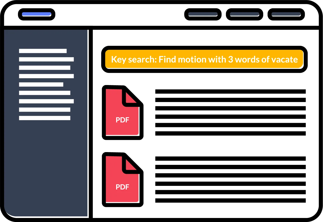 With keyword searching, you can sift through millions of records in seconds by combining keywords with logical operators and filters. Every PDF in our system is transformed into searchable text so you can find anything, fast.