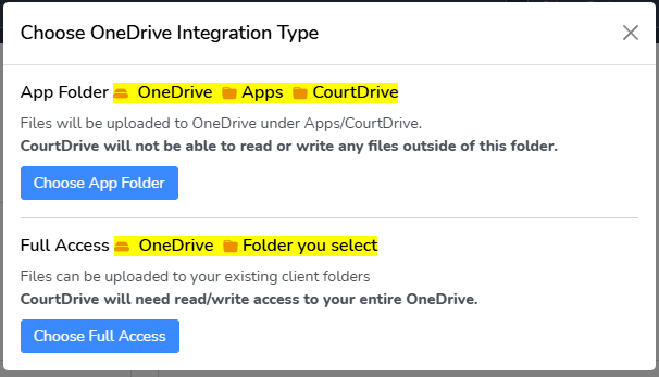 To connect to OneDrive, you must choose an Integration Type. Selecting ‘App Folder’ will create a single CourtDrive folder, in which all client/case folders must be placed.