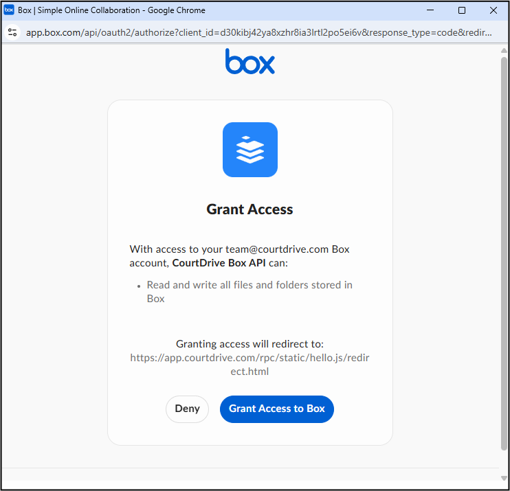 When connecting to Box, you will need to authorize access, in order for CourtDrive to upload documents.