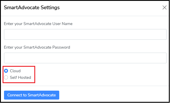 You will need to choose the SmartAdvocate system that you are logging in to, Cloud-based or Self-Hosted, before you will be able to connect.