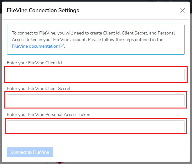 Use steps provided in FileVine documentation to get the required connection information.. Your admin(s) may need to contact FileVine support for this information.