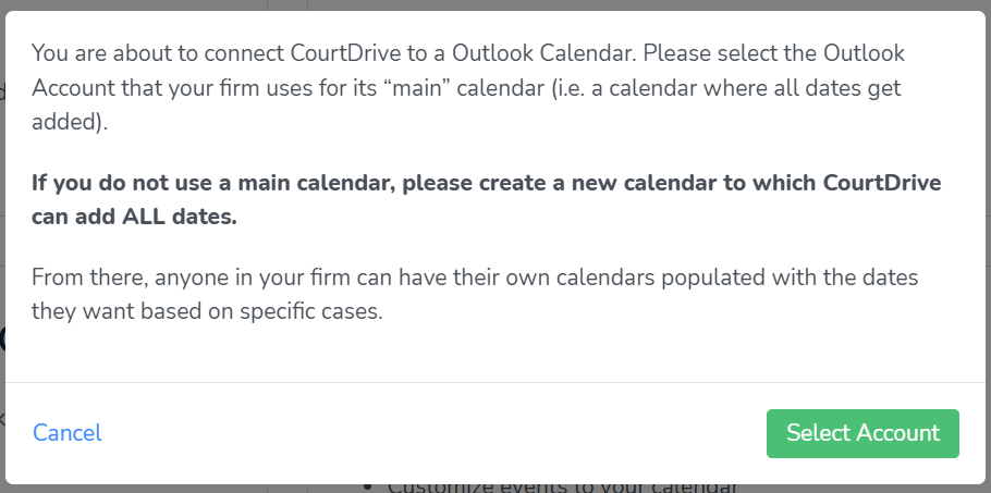 For any service you connect to, you will need to configure global settings, i.e. settings that affect how the automatic syncing works for all your cases on CourtDrive. There are also "per case" settings you can use, covered in the "Mapping a Case" section below.