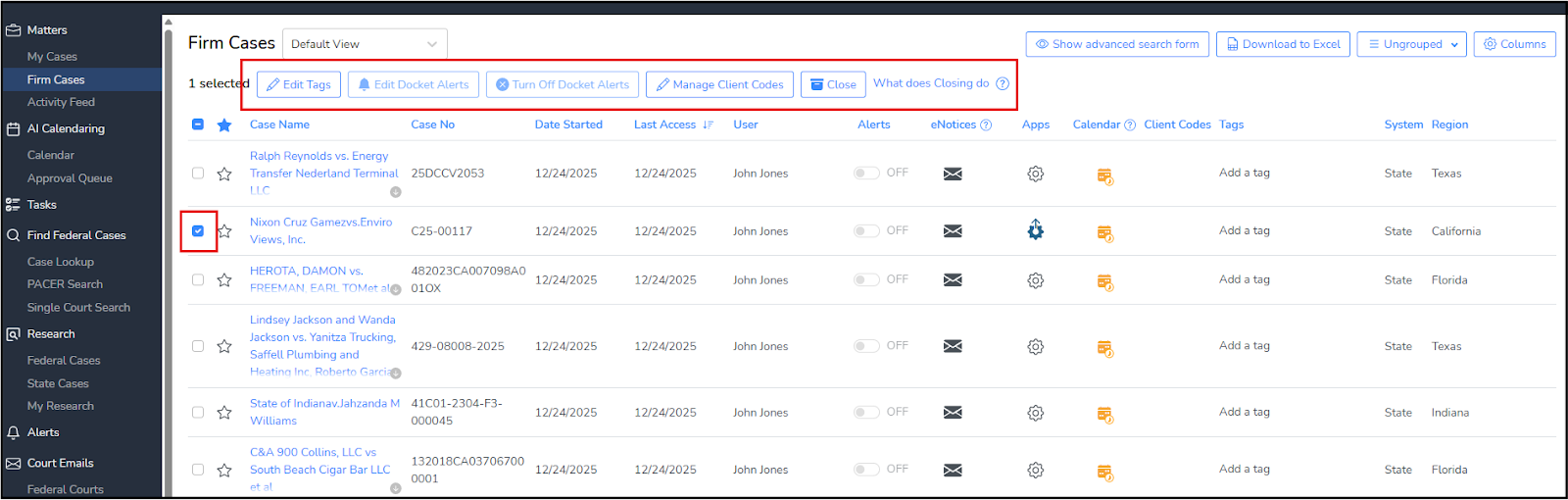 Bulk Operations are designed to respect existing case settings, ensuring that only applicable changes are made to each case. This allows you to safely manage large case lists while maintaining accuracy across your firm’s data.