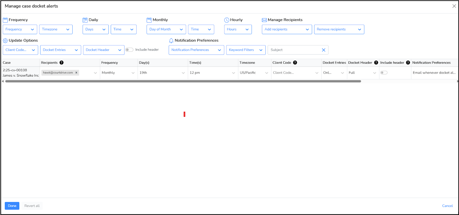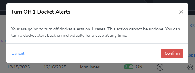 Use Edit Docket Alerts to update docket alert settings in bulk for selected cases.