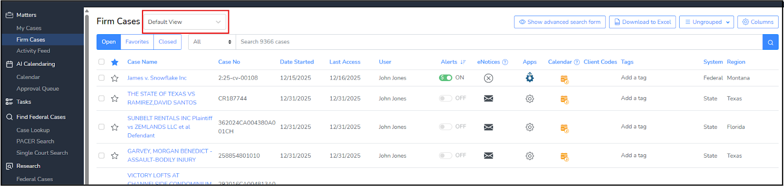 You can search and view everyone's cases in the firm. Use the search bar to immediately search the Firm Cases. Click on the case name to open the case.