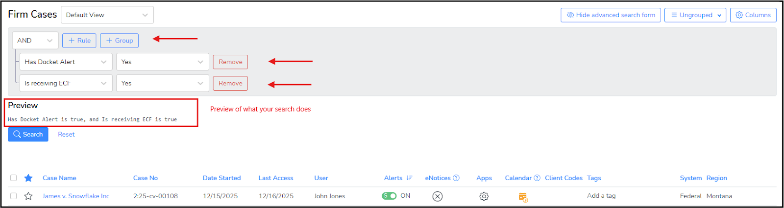 Selecting this button will open up a Search form. From here, you can enter multiple Rules, including Grouped rules. The Preview section underneath will provide you with an understanding of what the rules you’ve set up will do.